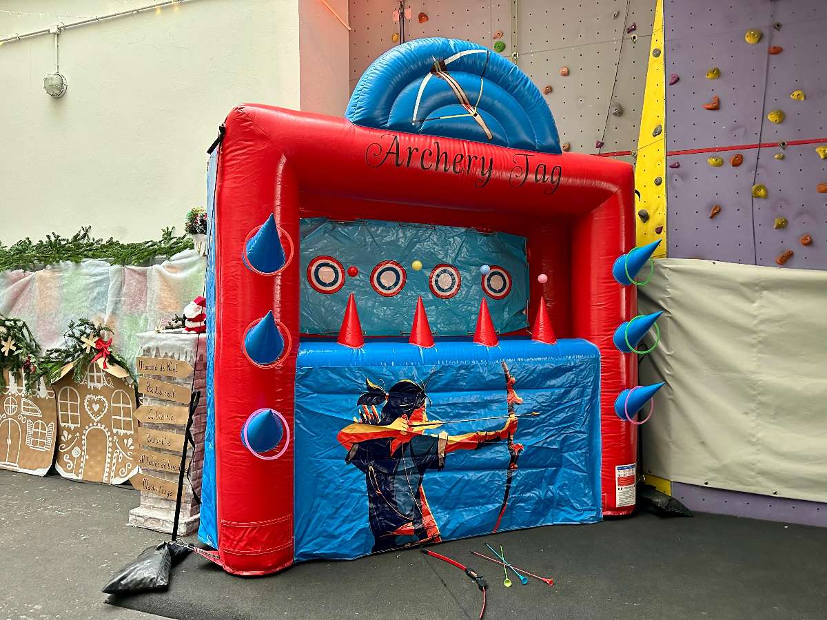Tir à l’arc gonflable : les enfants visent une cible à l’aide de flèches à embout scratch, en toute sécurité.